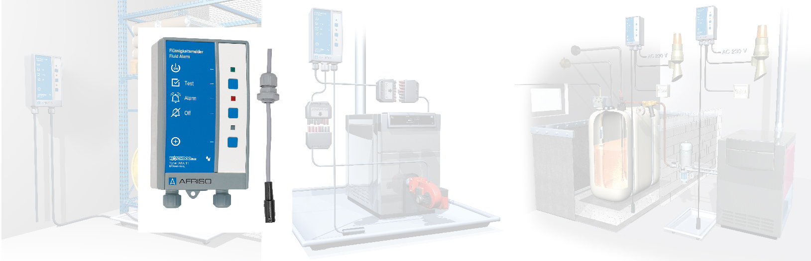 Der Flüssigkeitsmelder AFA 11 besteht aus einem Signalteil mit Prüf-/Quittiertaste, einem Relaisausgang sowie der optoelektronischen Sonde, die im zu überwachenden Bereich an der tiefsten Stelle montiert wird. So kann ausgelaufene Flüssigkeit zum Beispiel in Lagerräumen, Domschächten, Auffangräumen oder dem Brennerraum frühzeitig erfasst werden. Im Fall der Fälle gibt das Warngerät eine optische und akustische Meldung ab. Über den potenzialfreien Relaiskontakt ist es möglich, zusätzliche externe Signalgeber wie Hupen oder Warnleuchten oder die Gebäudeleittechnik anzubinden. Darüber hinaus ist es optional möglich, eine 9-V-Batterie anzuschließen, sodass bei einem Netzausfall ein Alarmton ausgelöst wird.