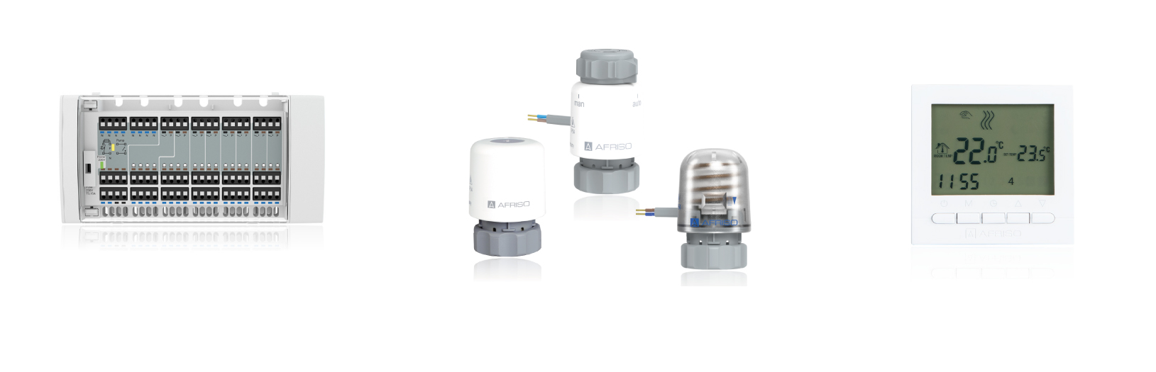 Der neueste Vertreter der beliebten CosiTherm®-Serie umfasst alle wesentlichen Funktionen, um Fußbodenheizungen funktionssicher zu verdrahten. An die steckerfertige 230-V-Klemmleiste können bis zu acht Raumthermostate und maximal 20 Stellantriebe angeschlossen werden. Der zugehörige Raumthermostat RT 10 D verfügt über ein Display zur Anzeige der Temperatur, Uhrzeit sowie des Heizbetriebs. Einfache Zeitprogramme (zum Beispiel Tag-/ Nacht-Schaltungen) ermöglichen individuelle Einstellungen. Zusätzlich ist auch eine Umwälzpumpe anschließbar. Diese wird automatisch abgeschaltet, wenn alle Stellantriebe stromlos (geschlossen) sind.